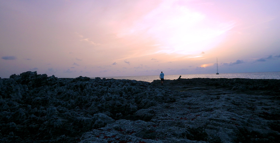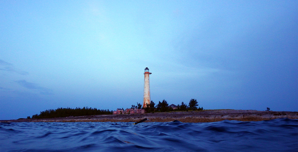 The final night we surprised everyone with a special anchor hold. On this night, we would set down tackle at the Northwest corner of Great Isaacs Cay, just beneath its looming 151 foot tall lighthouse. Before dinner, five of us took off our researcher pins and swam to the island as explorers. It was an incredible experience. The rocky landscape on this island was hostile, rugged and decrepit. The lighthouse, which had a newly installed solar panel, does not seem to be working as it should. Only a faint glow could be seen once the sunlight was fully extinguished. There were small house like structures surrounding the base, all of which had crumbled with exception to the walls and portions of their rafters. It was fun to imagine living there, with only a small, dense section of Australian pines. As with much of the Bermuda Triangle, so too did this island lay claim to a mysterious disappearance of two lighthouse caretakers. There was barely any soil, but patches of grass grew from the razor sharp limestone with the surrounding water crashing onto the island from all sides.